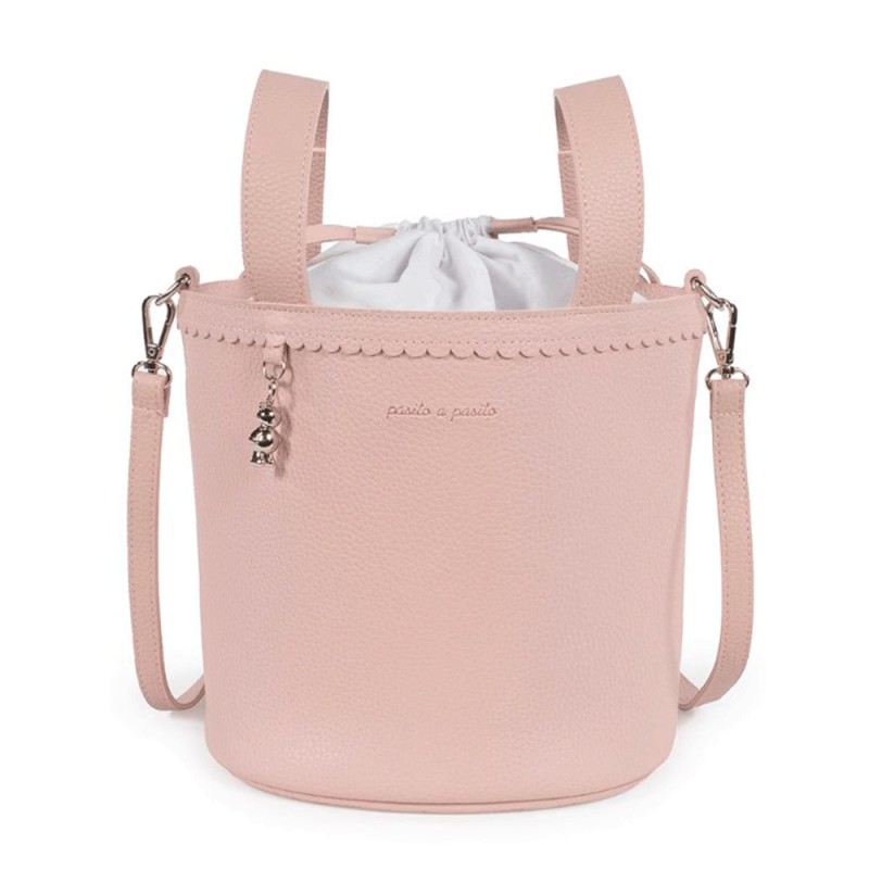 La Bolsa Bucket Pasito a Pasito Icon es una opción práctica y con estilo para familias que necesitan llevar lo imprescindible del día a día de forma ordenada cuando salen con su bebé. Gracias a su formato tipo “bucket”, ofrece un acceso cómodo al contenido y, además, ayuda a mantener cada cosa en su sitio. Su cierre de tipo saco con cordón ajustable protege tus pertenencias mientras camináis, y resulta muy útil cuando tenéis que moveros rápido o cambiar de plan sobre la marcha. Por si fuera poco, incluye diferentes formas de llevarla, adaptándose tanto a paseos cortos como a salidas más largas. Así, podrás usarla como bandolera o colocarla directamente en el carrito, según lo que te venga mejor en cada momento.