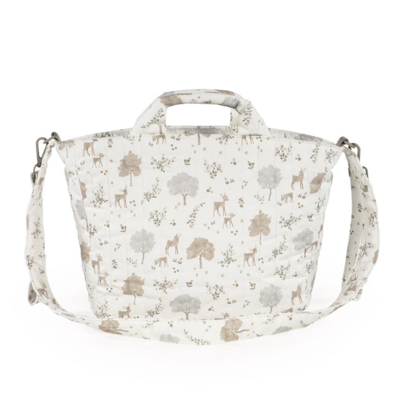 - Material principal: loneta de algodón 100% con estampado en tonos neutros.