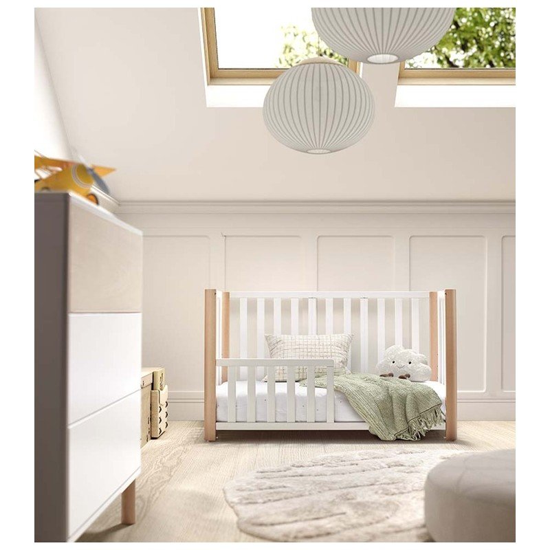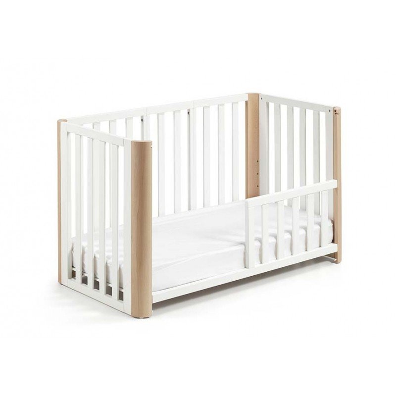 Este modelo destaca por ser una cuna 5 en 1 para utilizar aproximadamente desde el nacimiento hasta los 5 años. Incluye un kit de colecho para medida de 90×50 cm, un kit de transformación para convertirla en cuna de 120×60 cm y una barrera para la etapa de cama Montessori (120×60 cm). Además, dispone de un lateral extraíble tanto en la configuración de 90×50 cm como en la de 120×60 cm, y lo mejor es que se extrae sin necesidad de herramientas, lo que hace más sencillo cambiar entre modos según el momento del día y las necesidades del descanso.