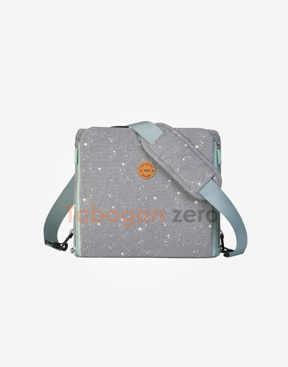 La Trona Portable Gris Saro es una trona portátil práctica y versátil, ideal para uso en casa o fuera de ella. También puede utilizarse como bolso, ofreciendo un amplio espacio para guardar los utensilios del bebé.